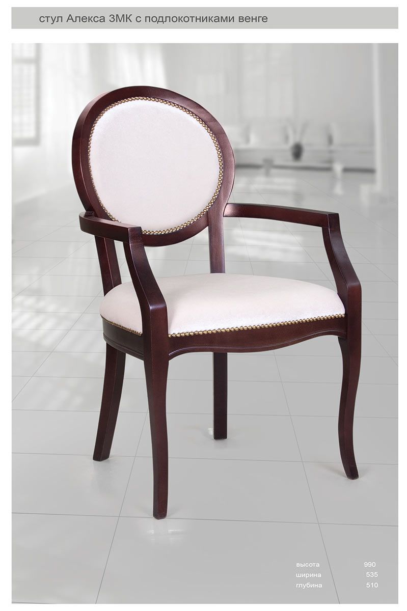Стул Алекса 3МК с подлокотниками венге из натурального дерева будет прекрасным приобретением для загородного дома выдержанного как в классическом, так и в современном стиле.